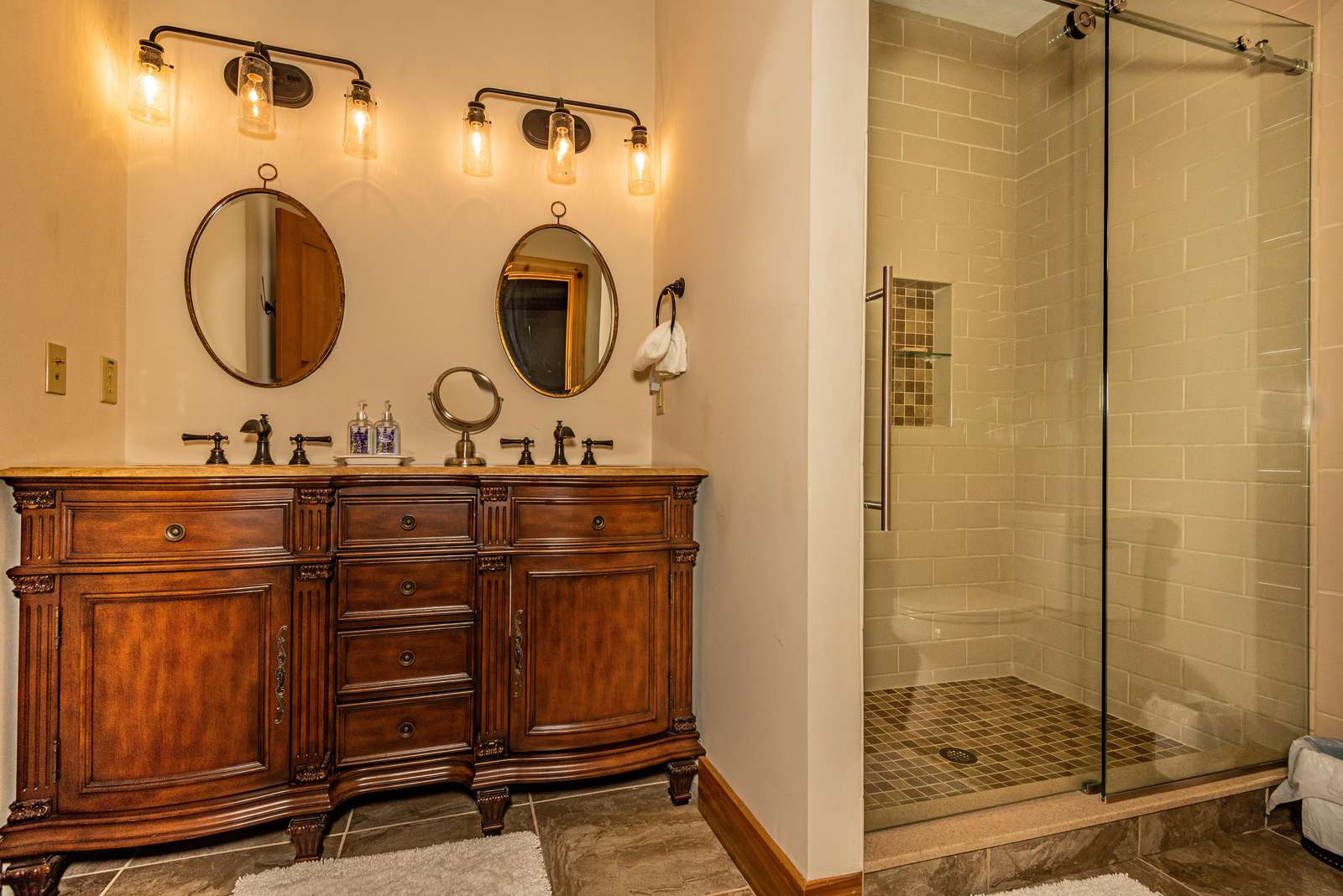 When bedtime rolls around, it’ll be just a short walk to jump into your jammmies and crawl into bed. The master bedroom features a comfy queen bed, a dresser, and a TV. The second bedroom is downstairs outfitted with a queen bed... great for the kiddos or another couple you may have invited to come along. No waiting for the shower though, as both bedrooms have their own private adjoining bathrooms.