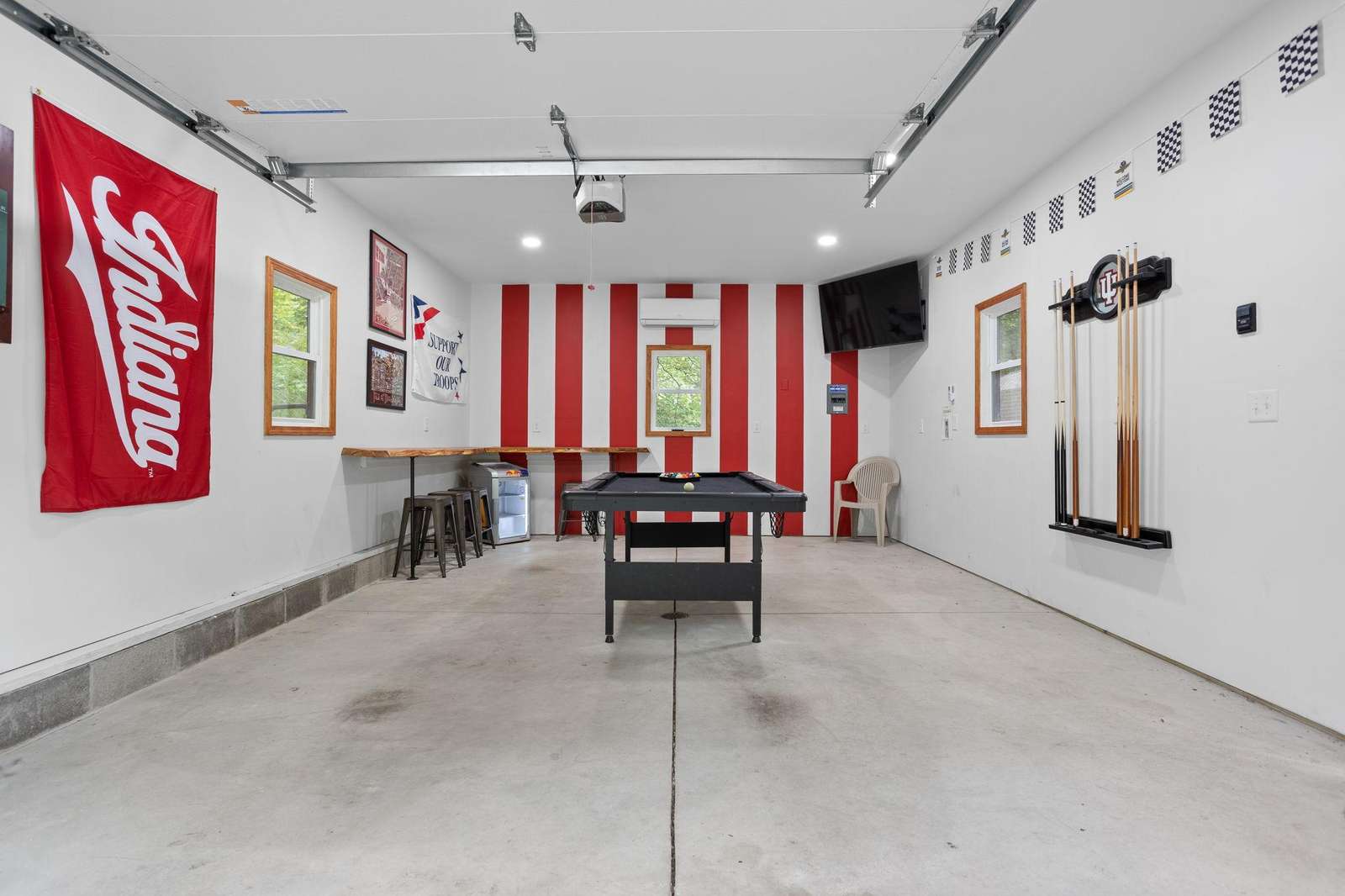 Spacious Indoor Entertainment: Fully finished garage with pool table, dartboard, bar, TV, fridge, and cornhole set – plus heat and AC for year-round comfort.