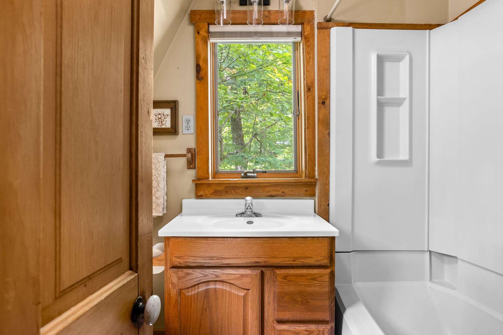 The main level also offers a full bathroom and lovely family room with big windows and a wood burning fireplace. You'll want to cozy up around the fire for a movie night on our Smart TV or call it a night on the pullout couch.