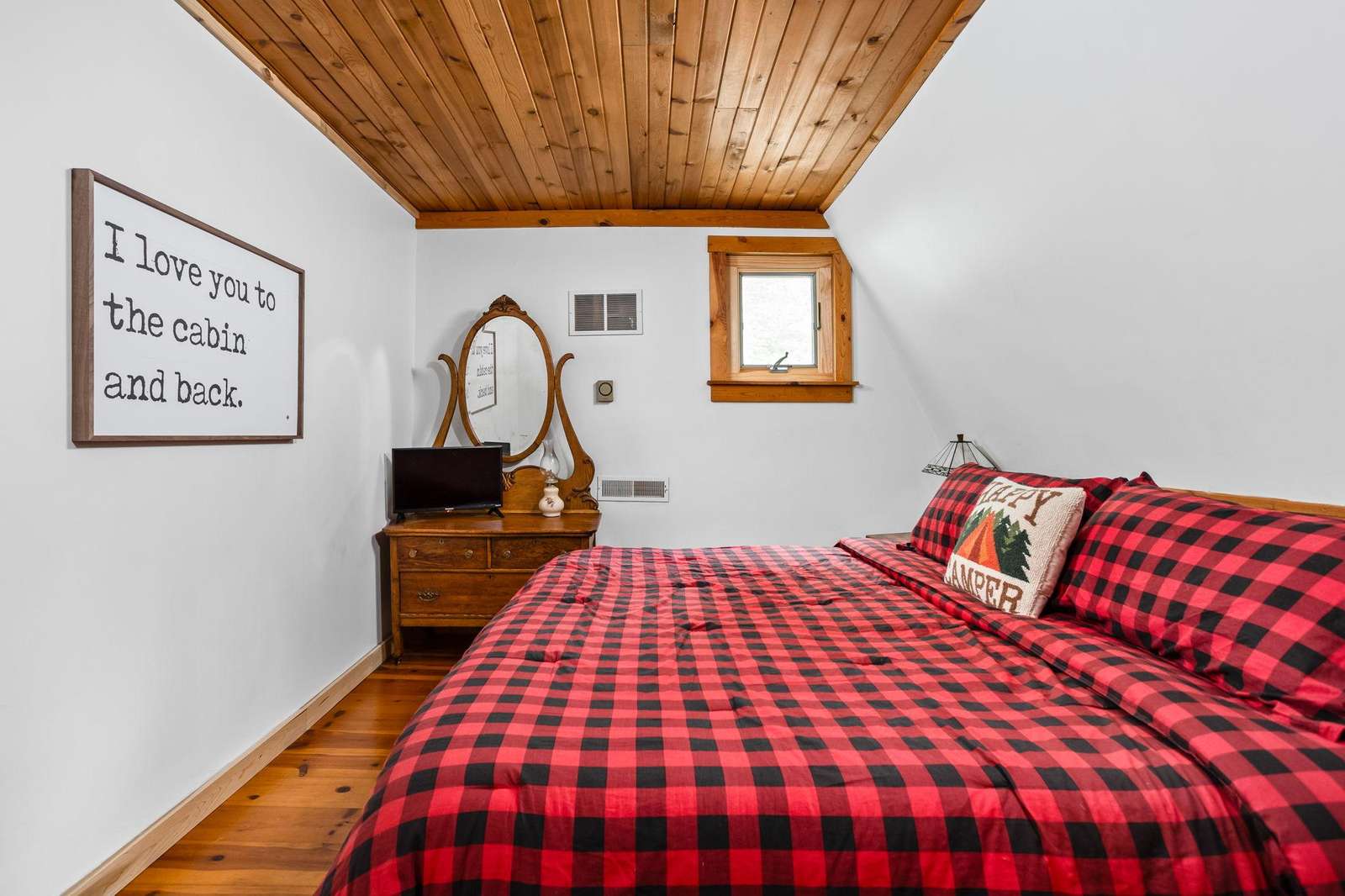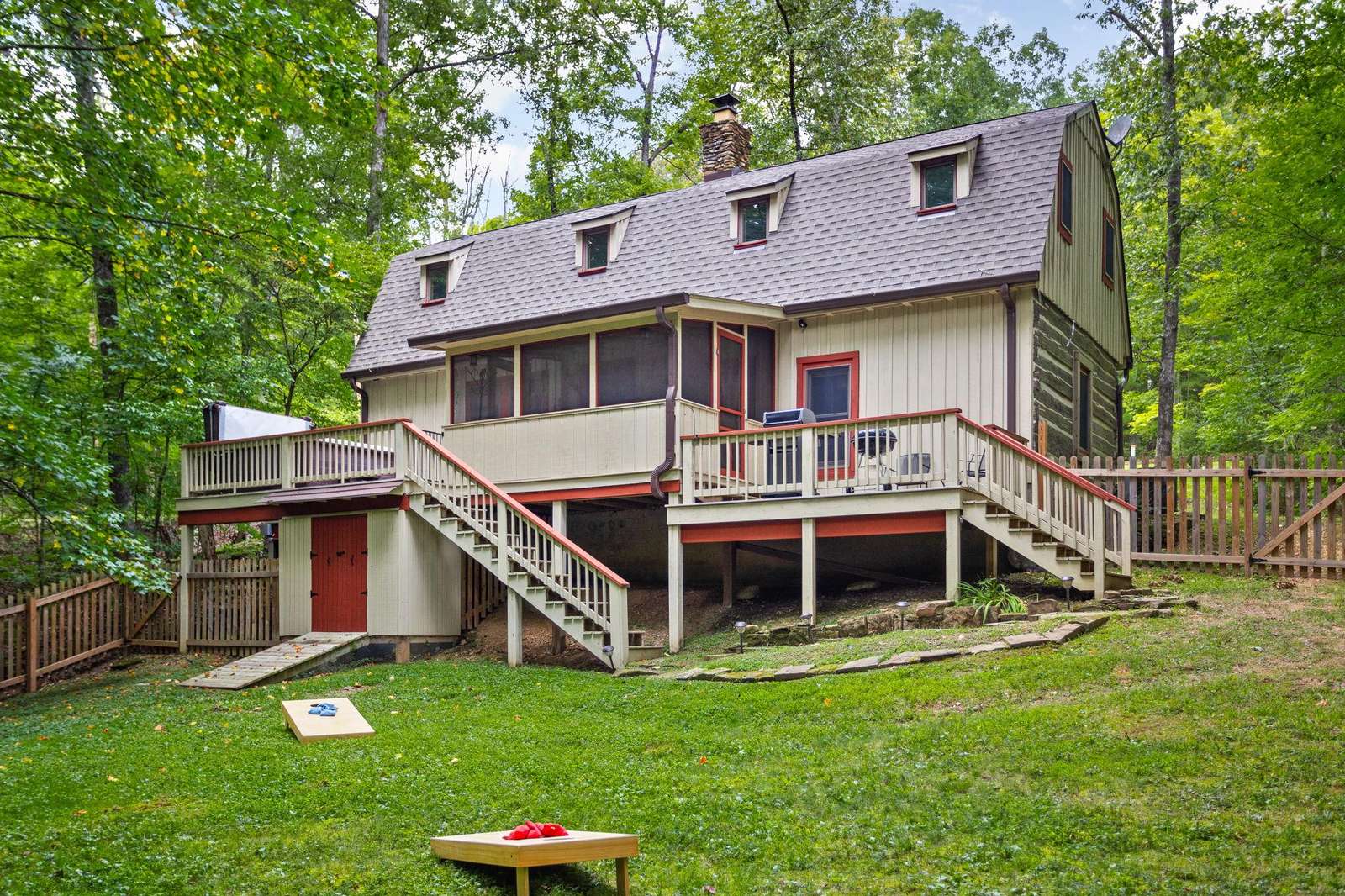 Saving the best for last, outback this cozy cabin has a screened-in porch and an uncovered deck. You'll enjoy the large private hot tub, fenced in backyard perfect for yard games (+ dogs/kids), and an outdoor bonfire pit.