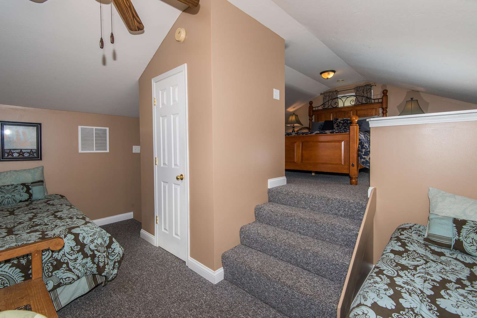 Loft bedroom: Queen bed + 2 singles, 28" satellite TV/DVD