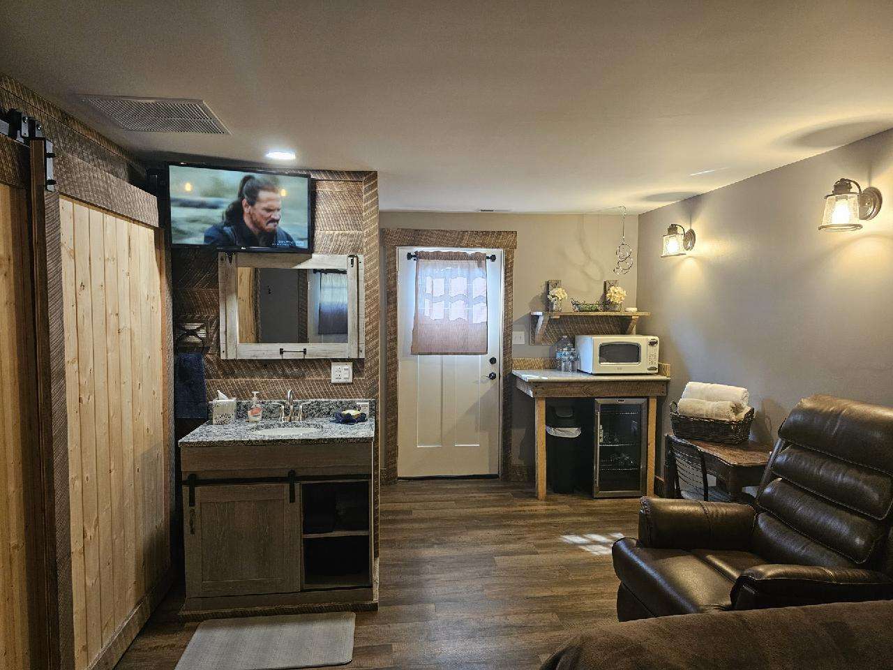 Suite: Queen bed + recliner, private bath