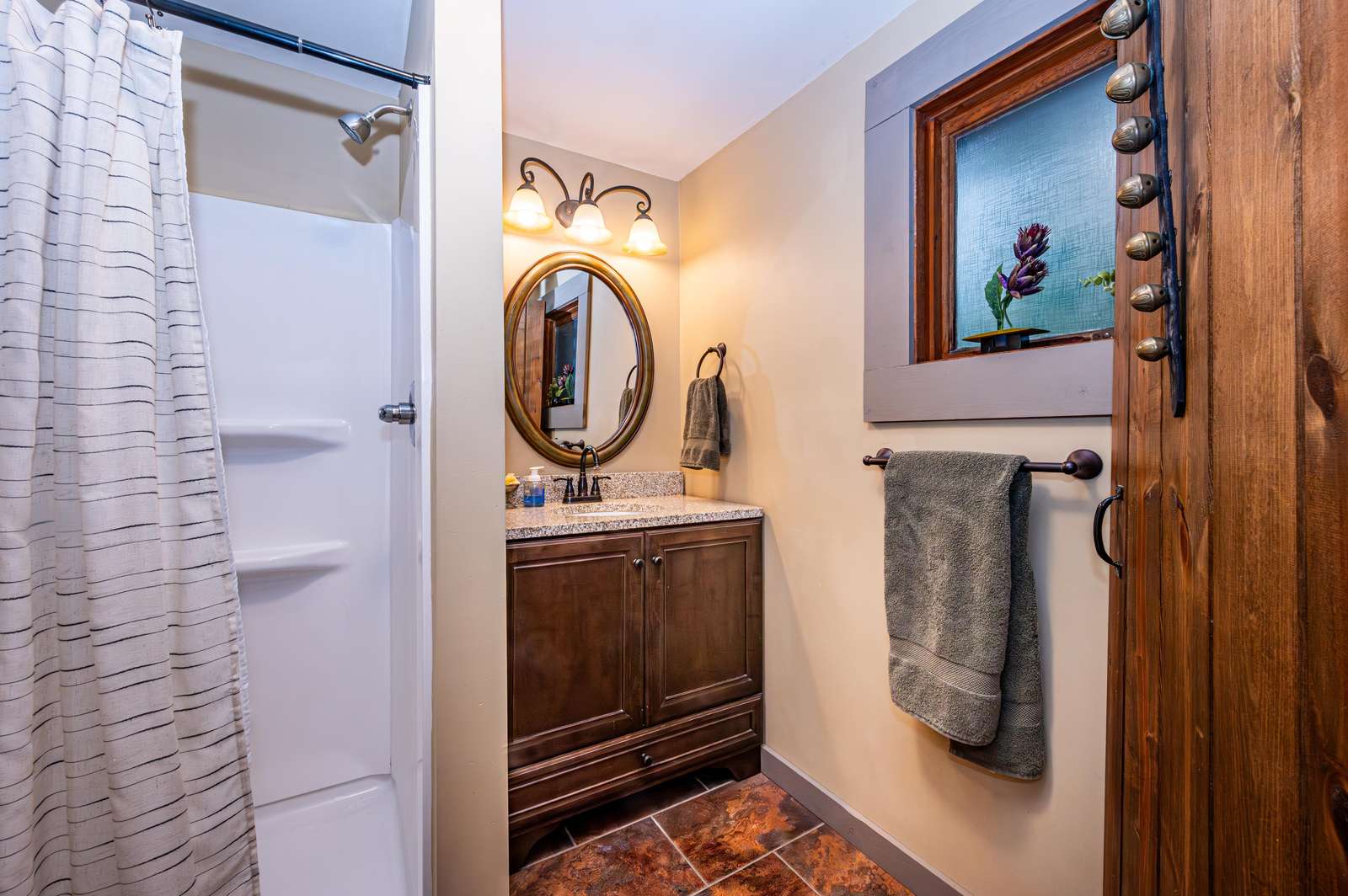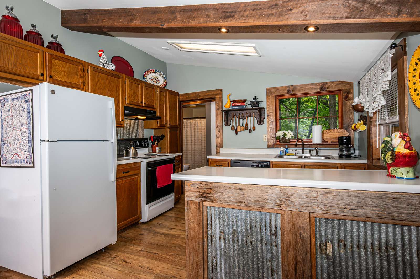 You’ll be part of nature in the private setting which is perched on a small bluff overlooking a babbling creek. The two decks take full advantage of this beautiful setting.