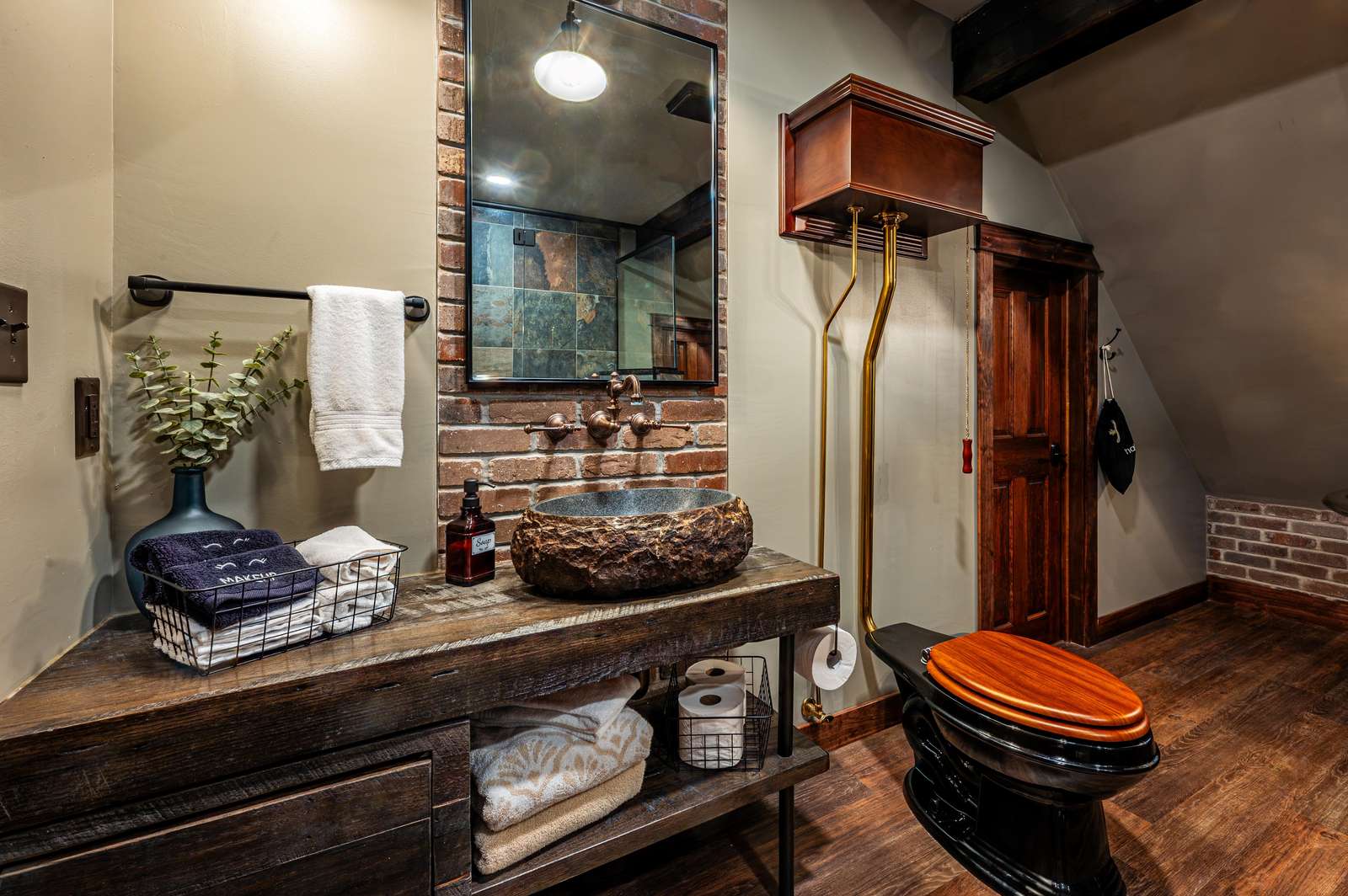 In the bathroom, you'll find a copper tub, an Italian rock sink & a stone tiled shower.