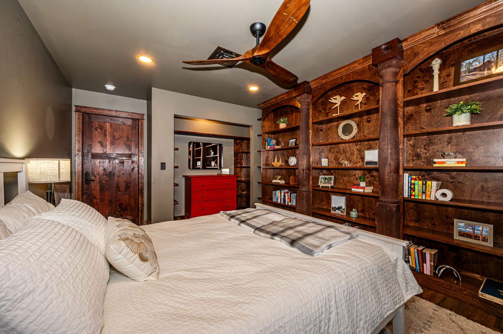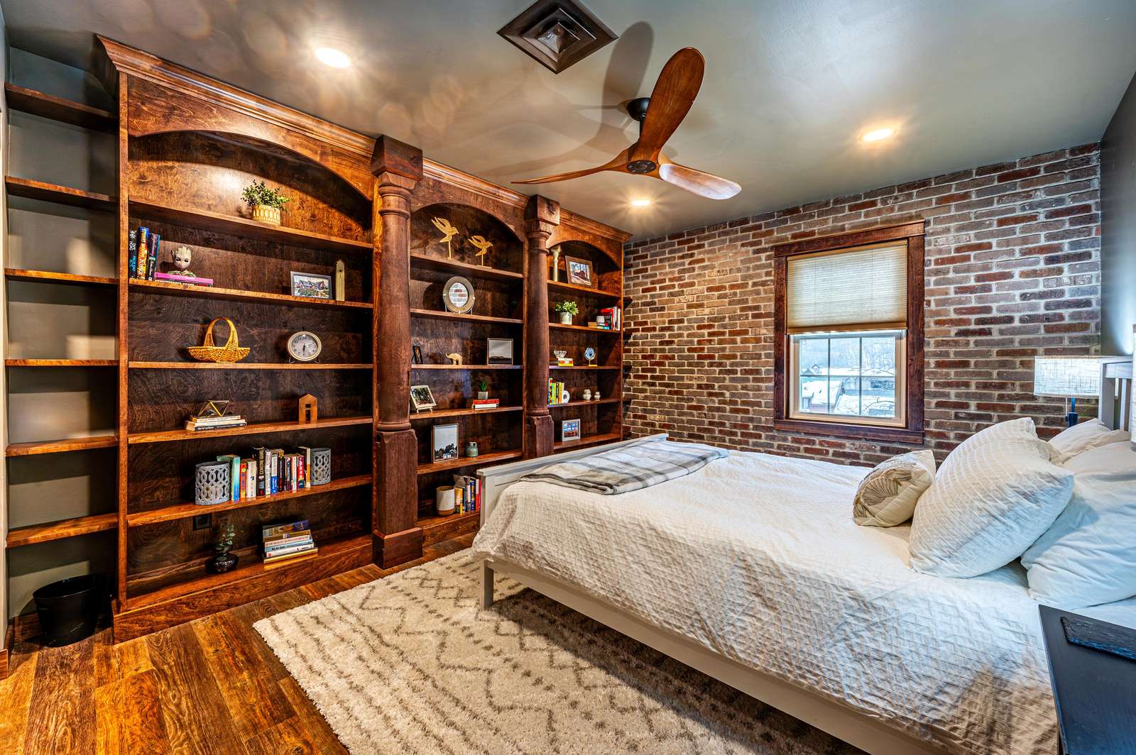 There are 2 queen bedrooms and one the queen bedrooms boasts mahogany bookshelves flanked by 100-year-old IU hall columns. The third bedroom is a sleeping nook with a single bed.