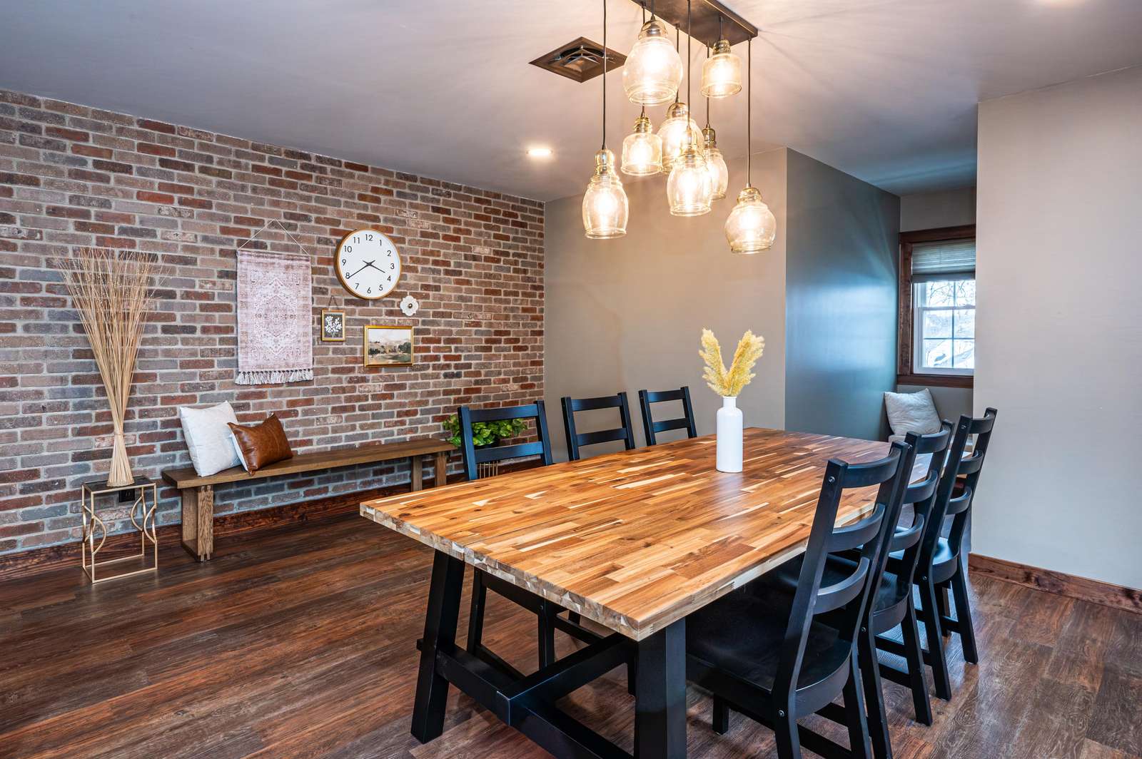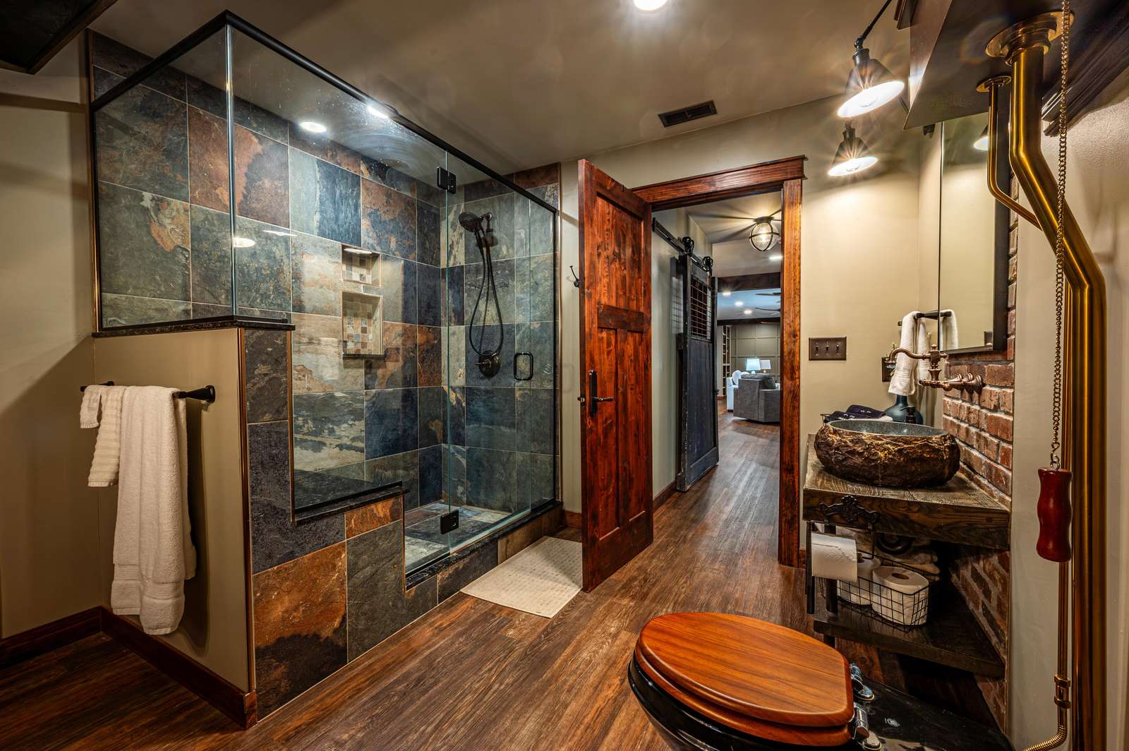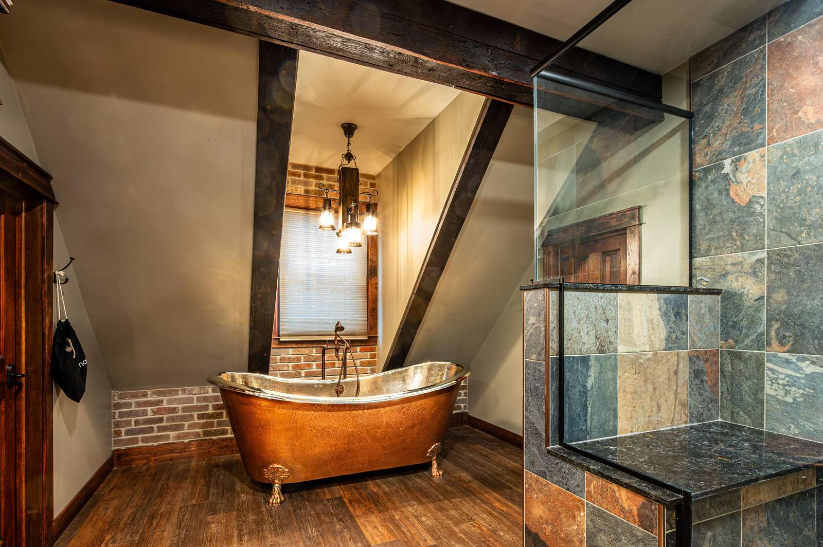 • Solid wood doors, copper trim & brick accent walls