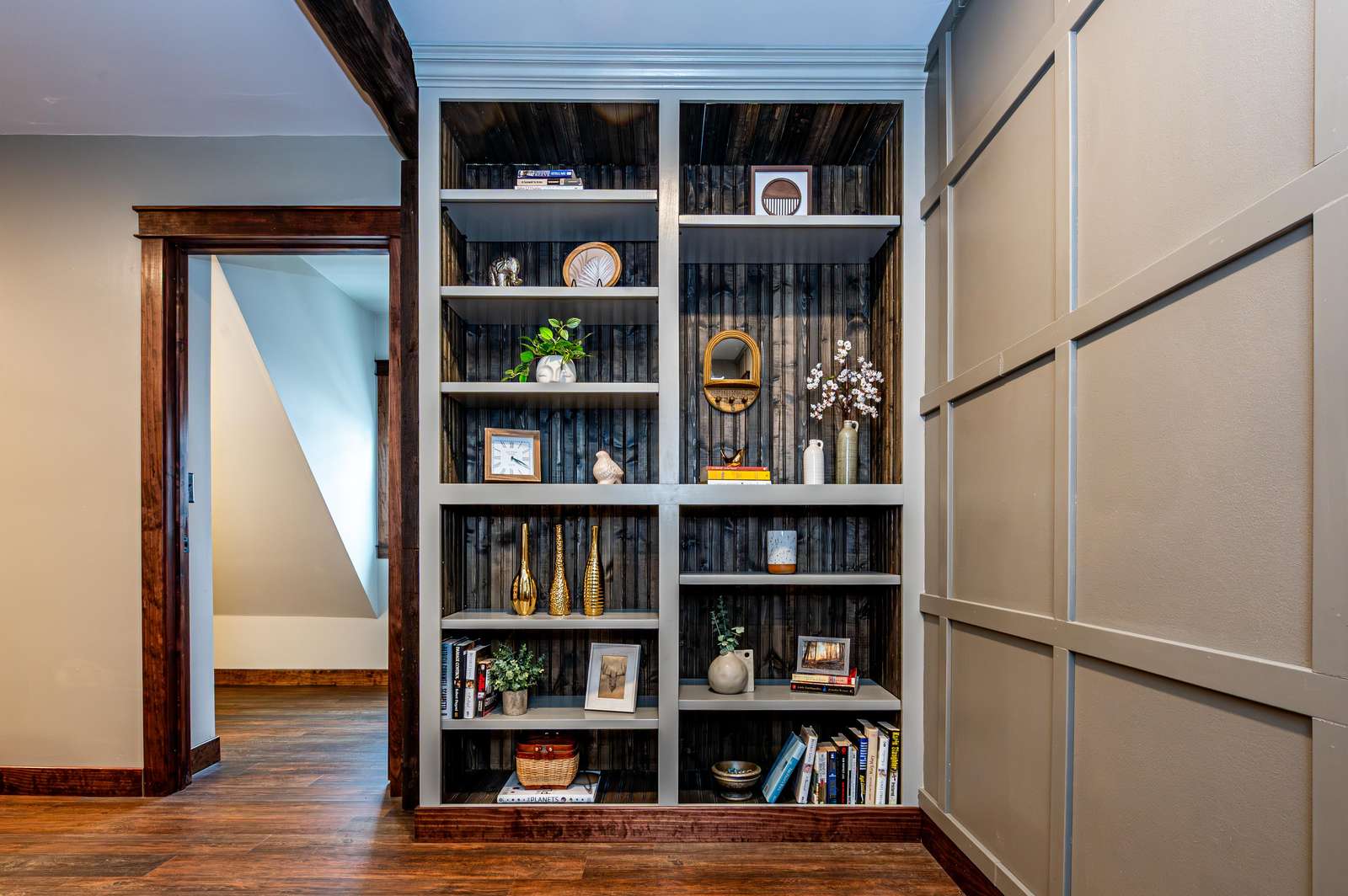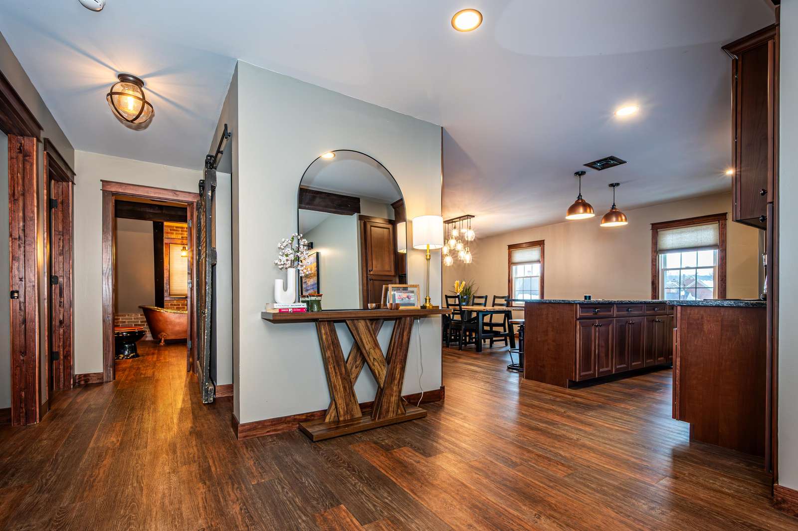 • Welcoming foyer with antique barnwood accents & custom wainscoting