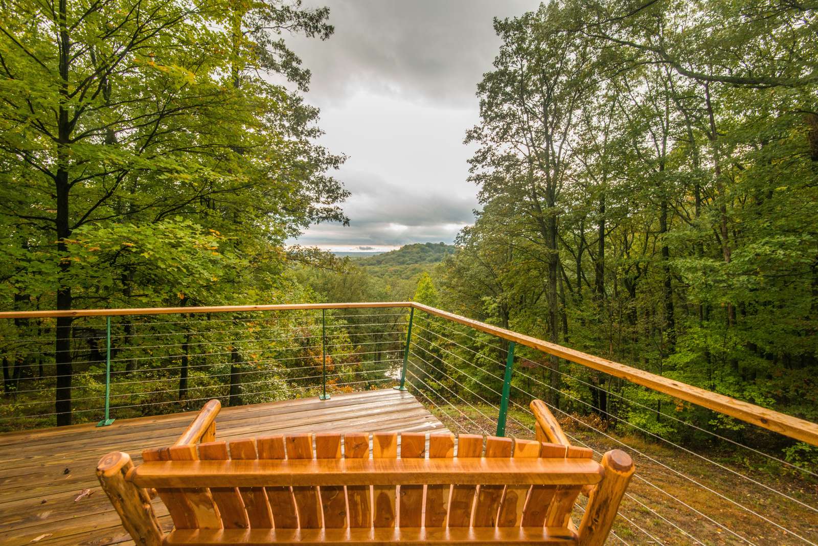 On a clear day you can see the tower at the south entrance of the Brown County State Park which is about five miles as the crow flies. In the fall, as you take a relaxing dip in the hot tub, you have one of the best private vistas to be enjoyed in this part of the world. A well-marked mile-long trail past the tree house, around the blue gill stocked pond and down to the confluence of the streams connects on the top of the west side of the property to the Yellowwood trail system which then leads back up to the path in the front of the cabin.