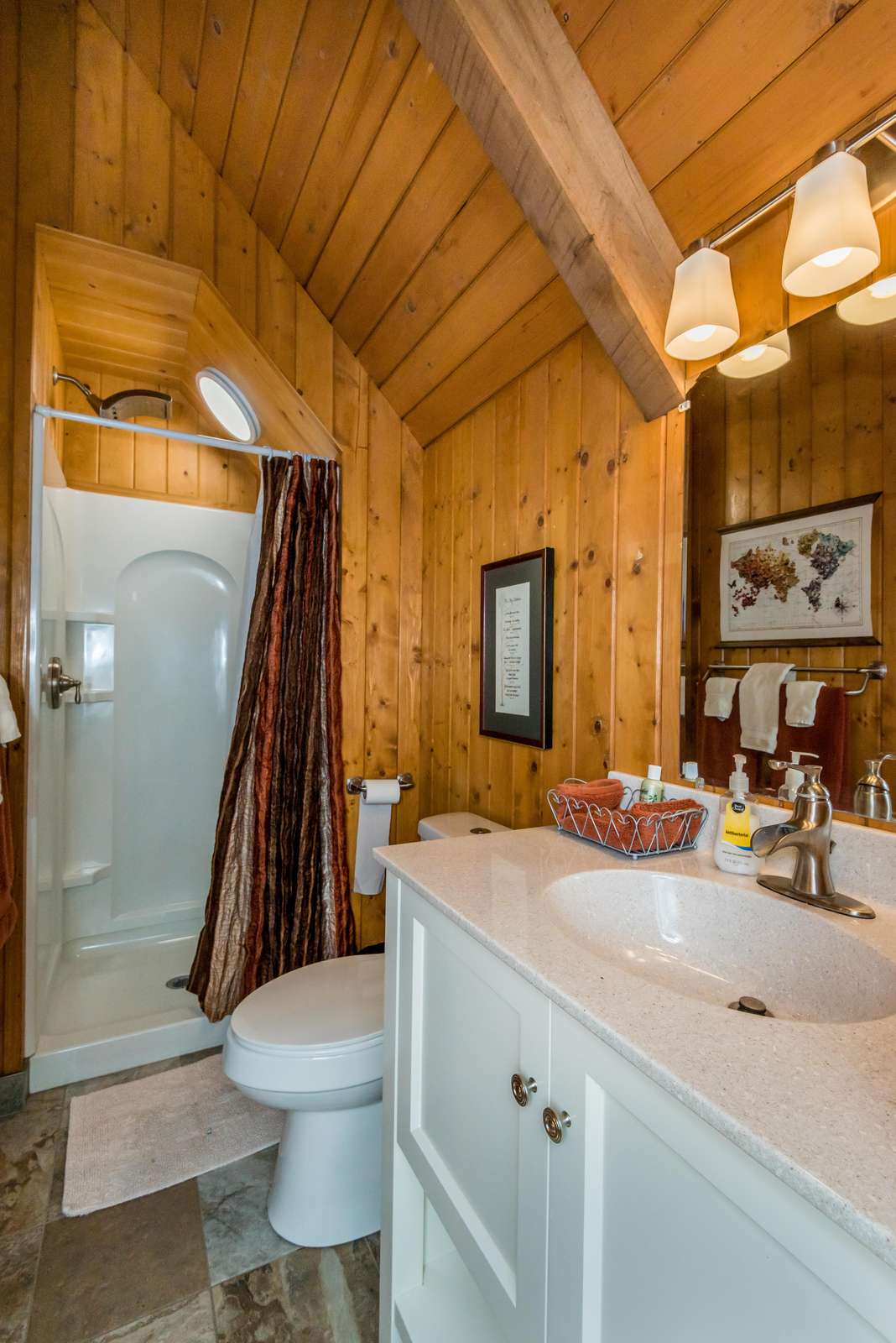 On the first floor the windows are large which brings the woods and vistas into the living space. The windows on the second floor are awash in summer green and fall yellow. The living space is cozy with a woodstove and comfortable seating.
