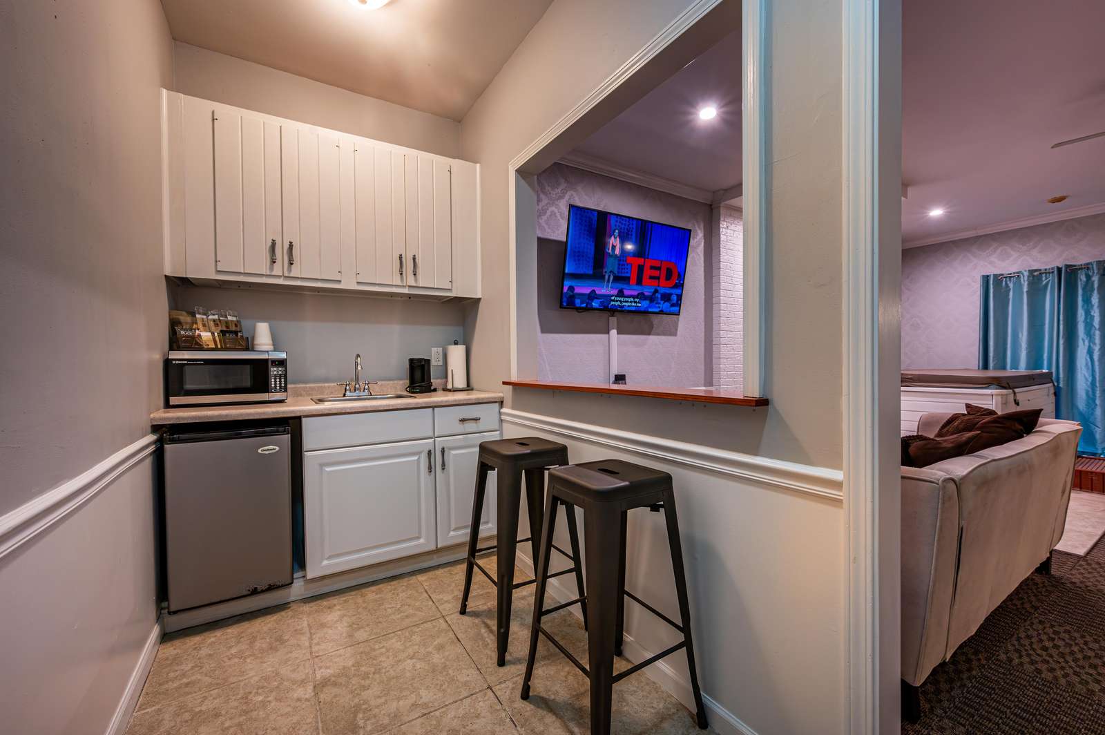 The suite features a king-size bed with a memory foam mattress, a sitting area with a Smart TV with satellite, and high-speed internet. The kitchenette includes a microwave, mini-fridge, sink, dishware, and a single-serve coffee maker for added convenience.
