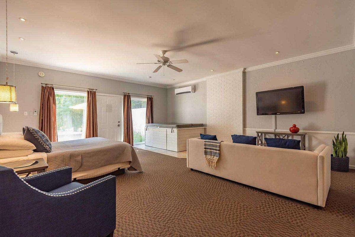 Unwind in the private in-room hot tub and enjoy the semi-private patio with outdoor seating. A private bathroom with walk-in shower, ground-floor access, and keypad entry complete the suite.