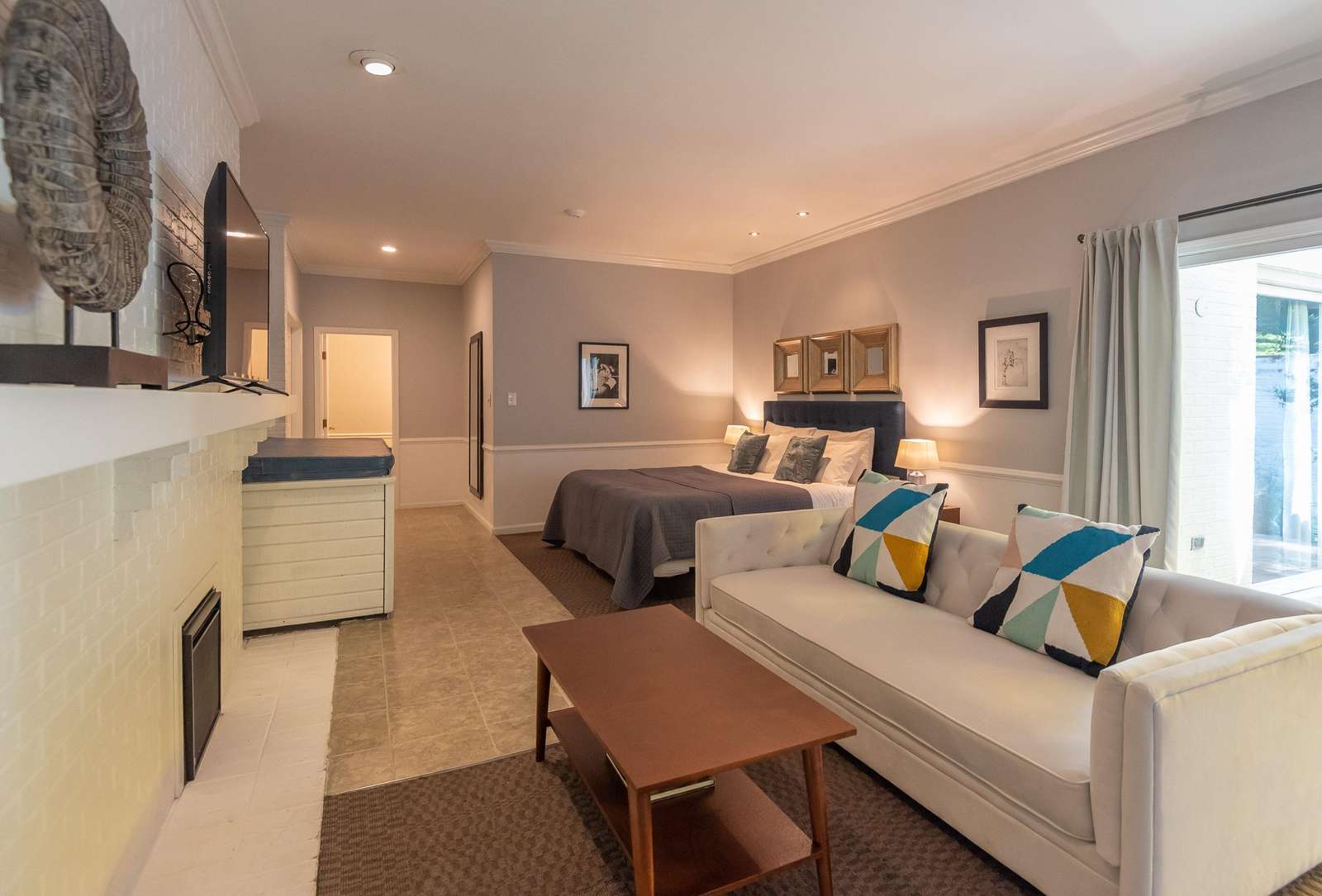 The highlight of the suite is the in-room hot tub, perfect for unwinding after a day out. A private bathroom with walk-in shower and ground-level access add to the comfort and convenience of your stay.
