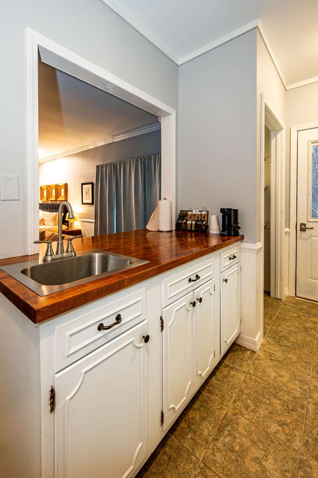 Kitchenette with mini fridge, microwave & single-serve coffee maker