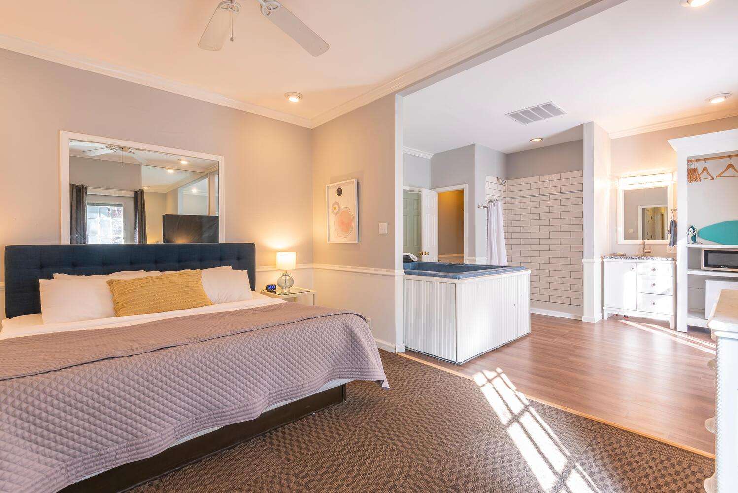 The suite’s standout feature is the private in-room hot tub, ideal for unwinding after a day exploring. A private bathroom with walk-in shower and ground-floor access provide comfort and convenience. Step outside to the private balcony for peaceful views of the woods and pond.